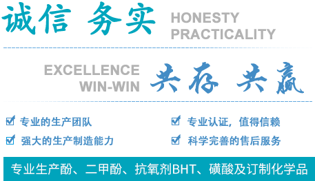 專業(yè)生產(chǎn)對,苯磺酸,苯酚磺酸等磺酸類產(chǎn)品及抗氧劑的生產(chǎn):如抗氧劑300,抗氧劑BHT等;酚類產(chǎn)品有間苯二酚、鄰甲酚及間甲酚等